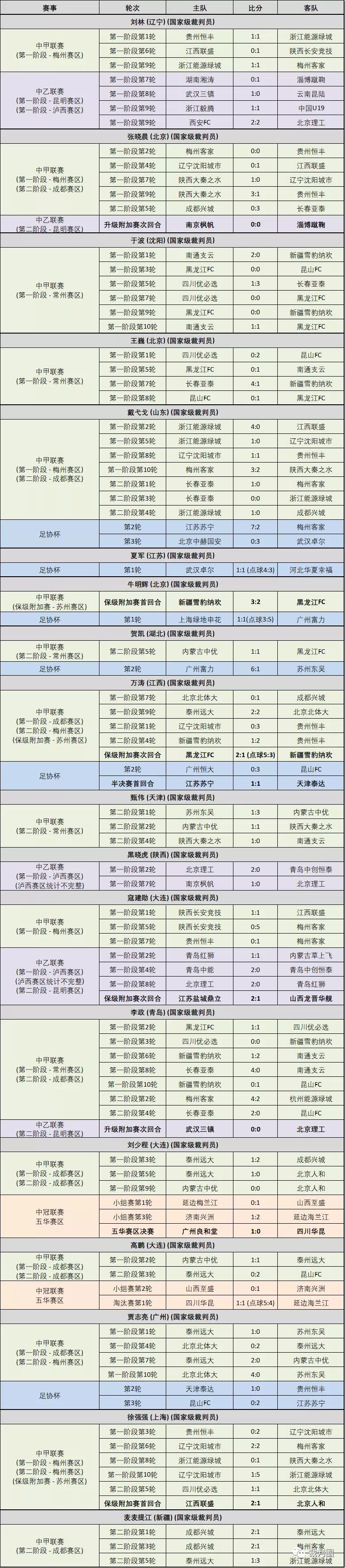 此外,小编还将贾志亮、徐强强以及麦麦提江三位未执法中超的裁判员纳入了统计范围。中甲裁判员贾志亮参与了足协杯最后阶段的执法,同为中甲裁判的徐强强则是执法了中甲保级附加赛的首回合较量,而实力不俗的中超裁判员麦麦提江虽遗憾地错过了中超的执法,但还是参与了中甲第二阶段的工作。