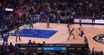 在独行侠对阵马刺的比赛中,东契奇在最后26.6秒命中三分,将领先优势扩大到5分,一举锁定胜局。