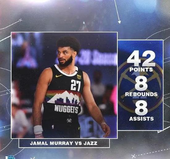 全场比赛穆雷26投17中砍下42分8板8助攻0失误,在场时掘金净胜20分。约老师下半场被限制住,穆雷挺身而出,接管比赛。整个第三节,穆雷单节得到了17分,而第四节的关键时刻,又是他连续投中了关键球,帮助掘金完成逆转锁定胜局。