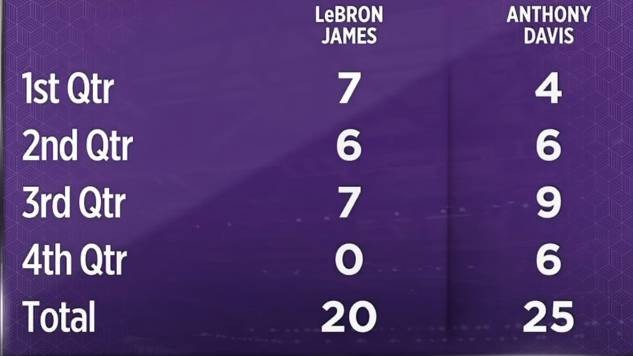 比赛结束后,电视转播商公布了詹姆斯本场的数据,全场老詹得到20分,但末节3中0没有得分。