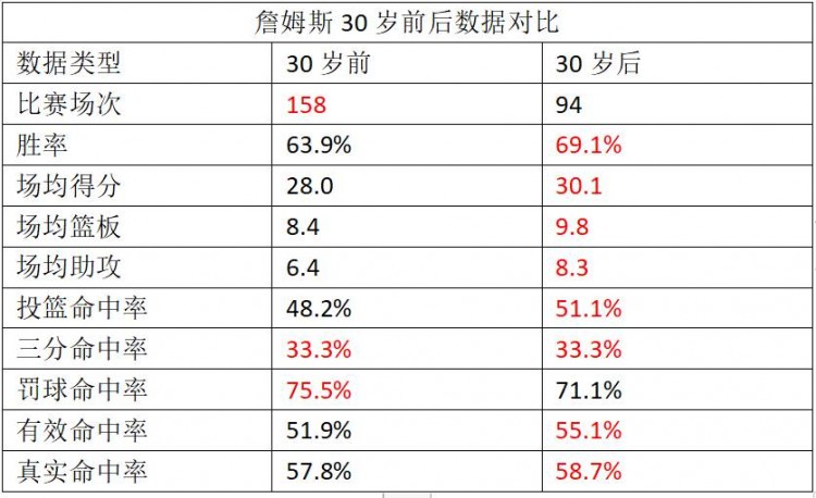直播吧9月23日讯 今天,美国数据分析师统计了詹姆斯在30岁之前和之后的各项数据(见下图)。