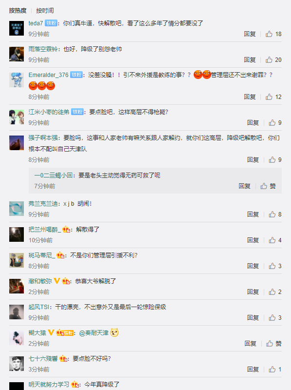 在泰达解雇施蒂利克的公告下,不少球迷留言声讨,“解散得了”、“要点脸吧”这种声音成为主流。